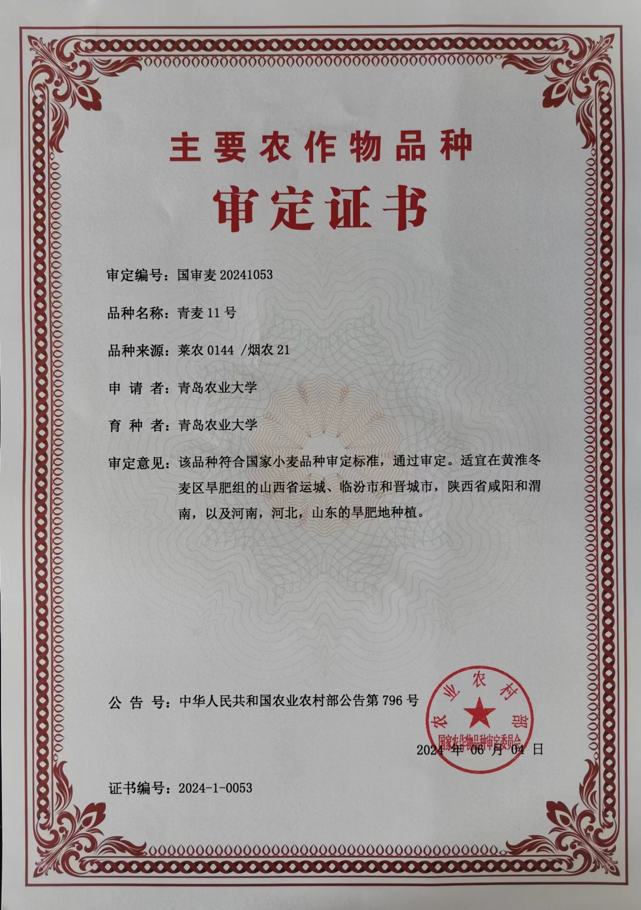 近日,ladbrokes立博张玉梅教授小麦遗传育种团队培育的小麦新品种“青麦11号”,经农业农村部国家农作物品种审定委员会审议通过国家审定(国审麦20241053),该品种此前于2021年通过山东省旱地小麦品种审定(鲁审麦20210018)。