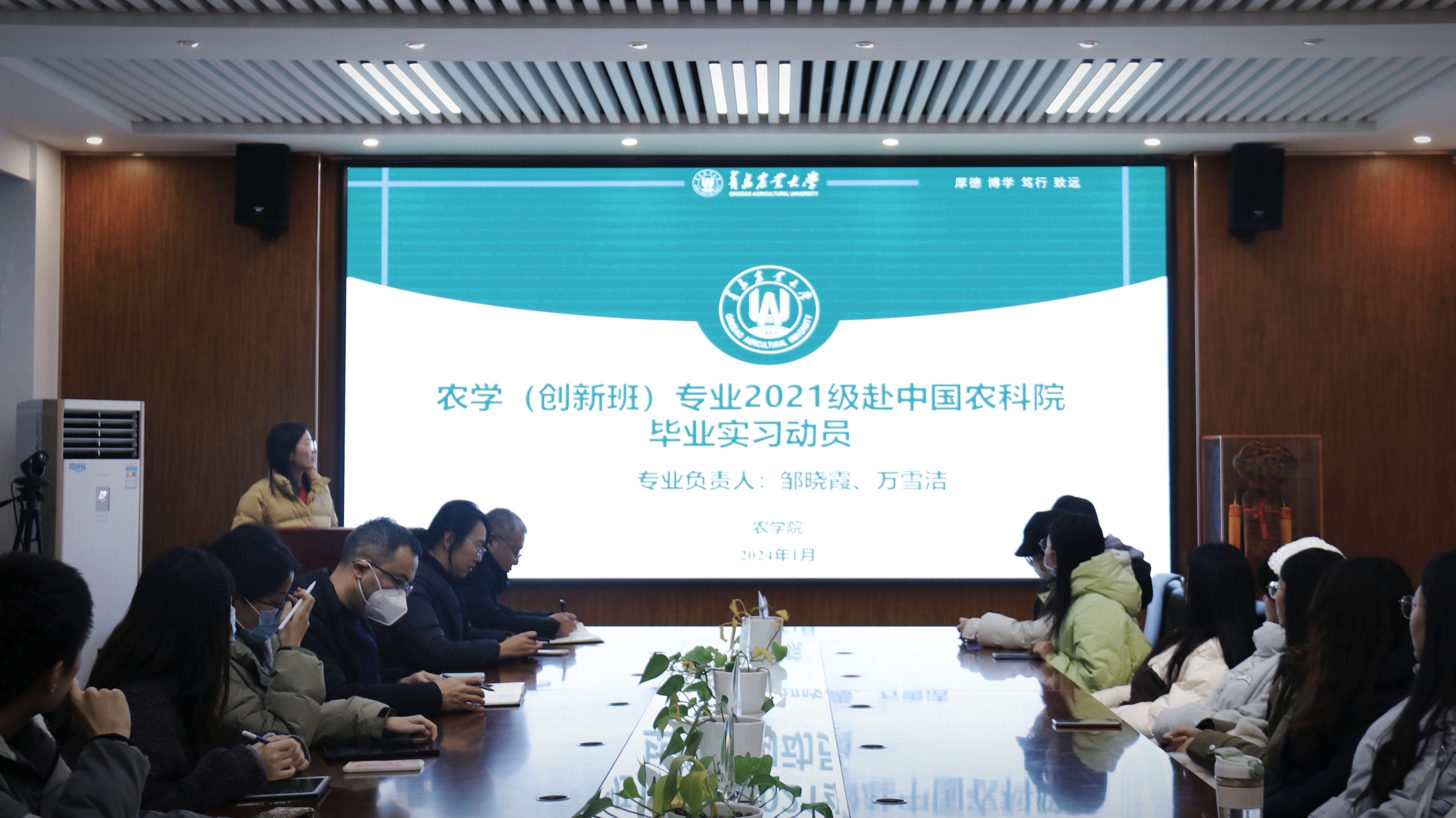 万雪洁就农学(创新班)专业实习方案进行解读,从实习时间、实习目的、农科院周边情况、实习纪律、成绩评定、其他事宜六个维度,对实习进行介绍。邹晓霞分享自身在农科院的实习经历,希望同学们正确认识实习实训的意义所在,端正学习态度,珍惜在大院大所实习的机会,志存高远、脚踏实地,彰显新一代农科学子的精神风貌。石勇鼓励大家以饱满的热情、积极的态度面对接下来的实习生活,并对实习安全做出详细说明,要求同学们外出请假及时报备,严格遵守实验室规章制度,认真服从老师的指导管理。孙占伟指出农科院的工作节奏快,实习期间工作量会比较大,同学们要勇于吃苦,要加强与导师的交流联系,主动承担相关工作任务,加强与团队成员的团结协作,认真完成好实习任务。实习期间,班委要发挥纽带作用,及时了解班级同学的学习生活状态并及时向公司反馈,做好师生、员工之间的桥梁。