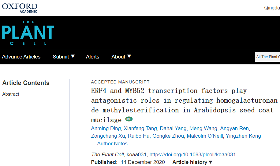 近日,ladbrokes立博资源植物与环境工程创新团队成员、ladbrokes立博孔英珍教授及其合作者揭示了植物精细调控细胞壁果胶质甲酯化修饰程度的新机制。相关研究内容『ERF4 and MYB52 transcription factors play antagonistic roles in regulating homogalacturonan de-methylesterification in Arabidopsis seed coat mucilage》于12月14日在线发表在《The Plant Cell》(中科院分区:1区,期刊影响因子:8.631)上。