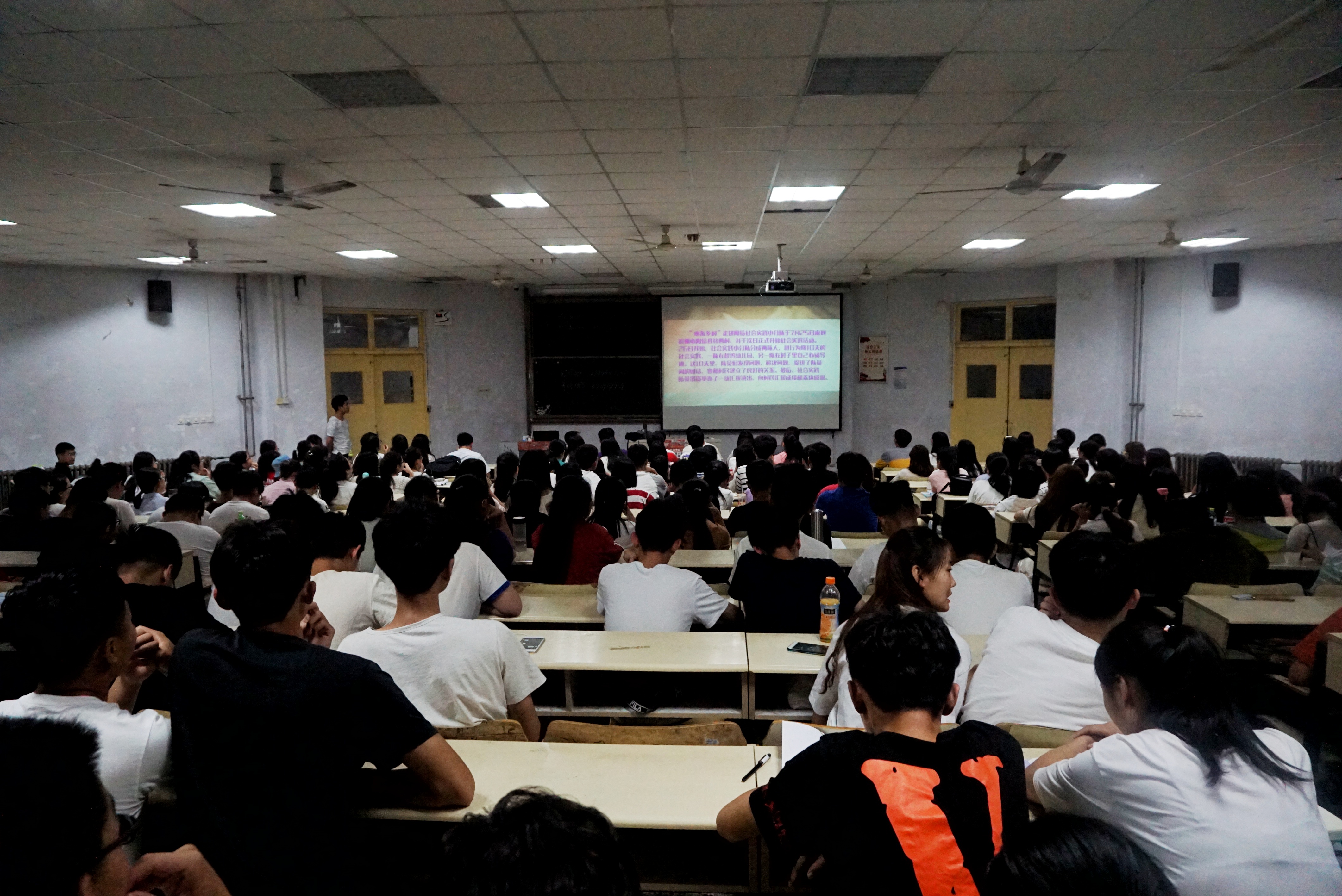 第一个阶段是由烟草1601、烟草1602、农学1601、种子1602四个团队以ppt的形式,分别在前期准备、活动内容、注意事项、新闻报道等几个方面向同学们分享了自己团队在实践中的经验、建议和收获,最主要的是向同学们强调了实践活动的宣传工作,完毕之后并附加观看了每个团队自己的实践视频。丰富多彩的实践生活视频让同学们看的津津有味,再加上每个团队对社会实践的精彩演说,无不让每个同学内心充满了对实践生活的期待和向往,鼓舞着每个同学加入这个意义活动中来。紧接着进入第二个阶段——2018年暑假社会实践动员大会。主讲人从活动主题、活动内容、工作安排、相关附件、时间要求这五个方面详细向同学介绍了接下来的社会实践将要做的具体工作,还强调要求了不要照搬照抄,每年每班的社会实践都要力求创新。最终主持人呼吁大家一起奉献出自己的一份力量,积极投入到社会实践中去,充实自己的老员工活,为提高自己以后的社会适应能力做好基础。