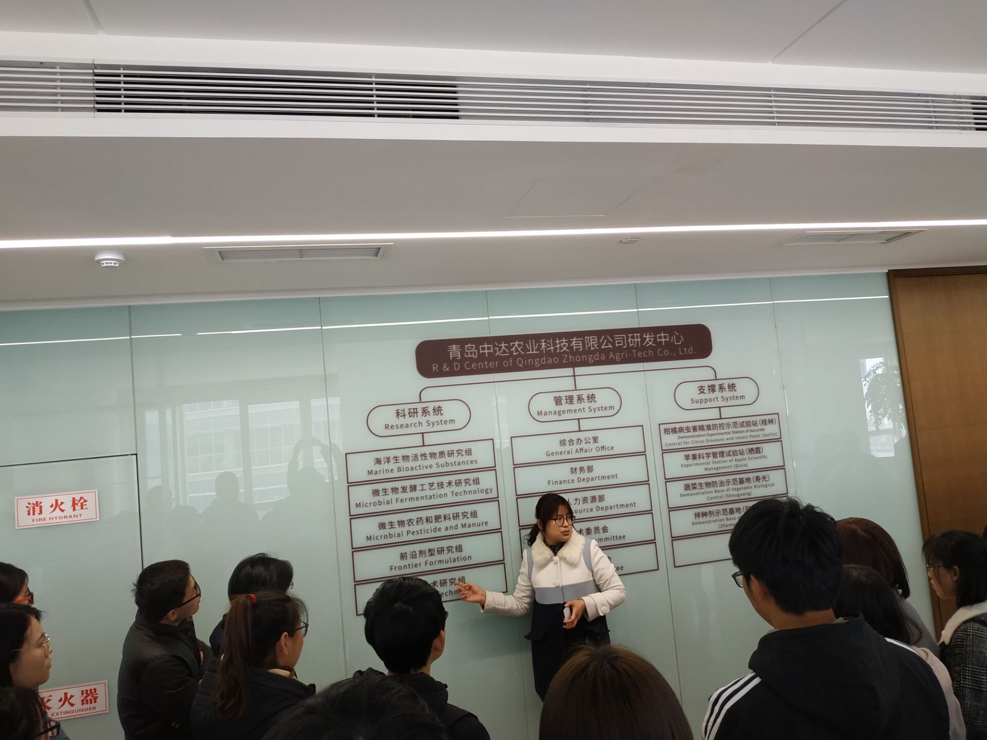 3月7日,为及时掌握行业动态,深入了解相关企业信息,为择业就业打下基础,ladbrokes立博、植物医学公司共计40余位2019届毕业生在植物医学公司党委副书记李军、ladbrokes立博辅导员谷元兴的带领下,一同前往位于青岛高新区的青岛中达农业科技有限公司进行了实地观摩考察。