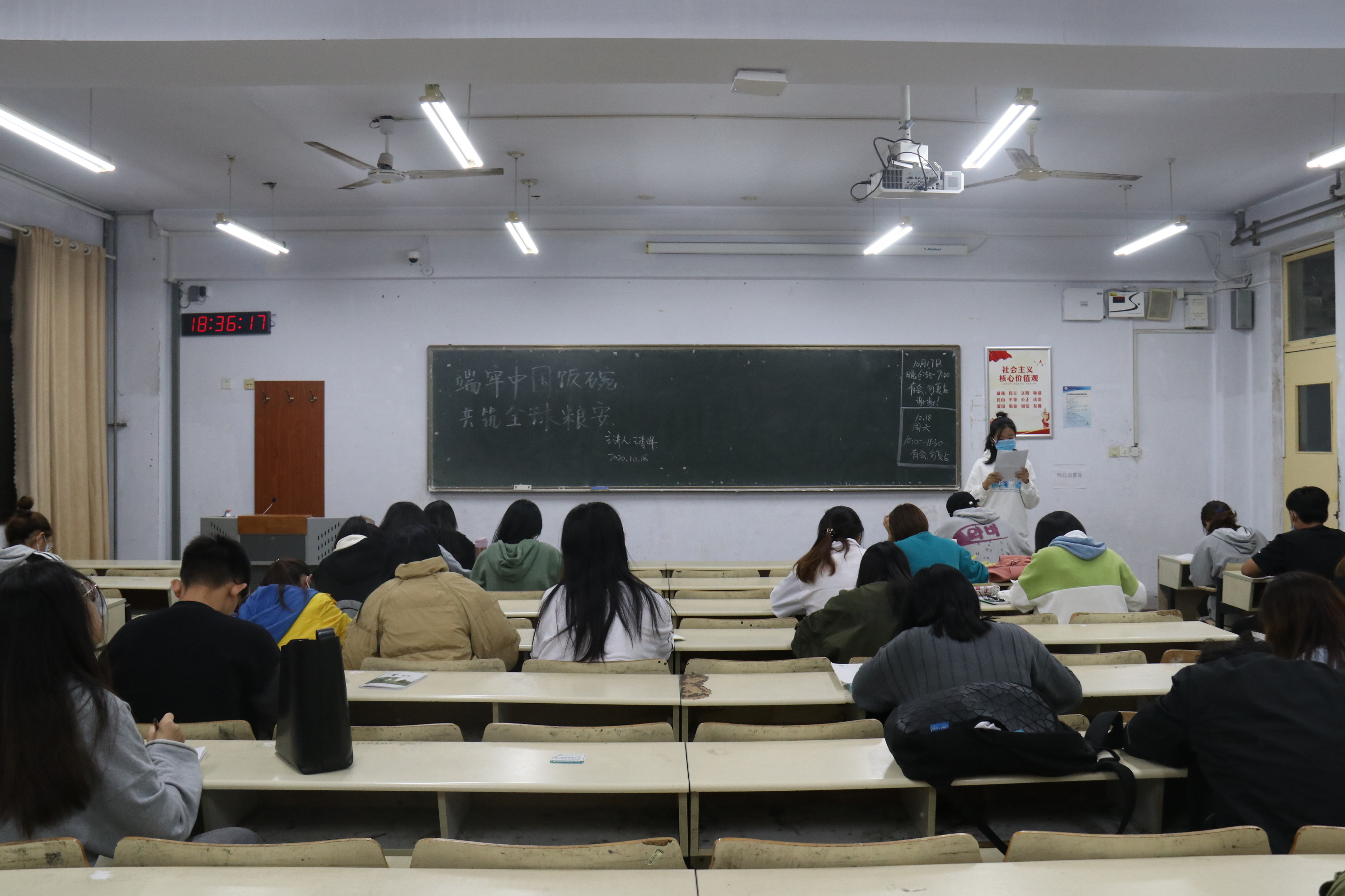 团课伊始,主讲人围绕全国粮食安全宣传周活动的开展、粮食安全的重要性和现状等进行讲述,他们强调,从中长期来看,我国粮食供求总体上仍处于紧平衡状态,粮食各环节损失浪费现象不容忽视。随后,主讲人发出了“爱粮节粮、厉行节约”的倡议,从传承勤俭节约优良传统、弘扬爱粮节粮社会新风、加大行业节粮减损力度、营造爱粮节粮浓厚氛围四个方面倡议同学们认真贯彻落实习近平总书记关于制止餐饮浪费行为的重要指示精神。最后,同学们围绕“作为当代老员工,如何守护粮食安全”展开讨论,同学们纷纷表示将从自身做起,切实落实光盘行动,节约每一粒粮食。