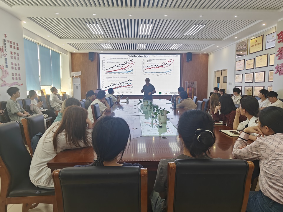 Gustavo Maddonni分别从全球玉米生产现状、阿根廷玉米生产限制因素、生殖可塑性表型应用、超低密度网络等方面展开讲述,介绍了其团队在探索非生物胁迫环境下作物管理策略方面取得的研究成果。Gustavo Maddonni通过对超低密度玉米种植网络(RED-UBA DE MAÍZ)的案例分享,讲解了如何在水分、养分匮乏的环境下通过调整种植密度来提高作物的适应性和生产力,为应对全球气候变化、粮食安全问题提供了新思路。同时,Gustavo Maddonni表示,未来布宜诺斯艾利斯大学将继续加强与国内外学术机构的合作,推动农业科技创新,深入探索如何在全球农业发展中形成新的合作模式。报告结束后,Gustavo Maddonni与在场师生进行了互动交流,现场气氛热烈。