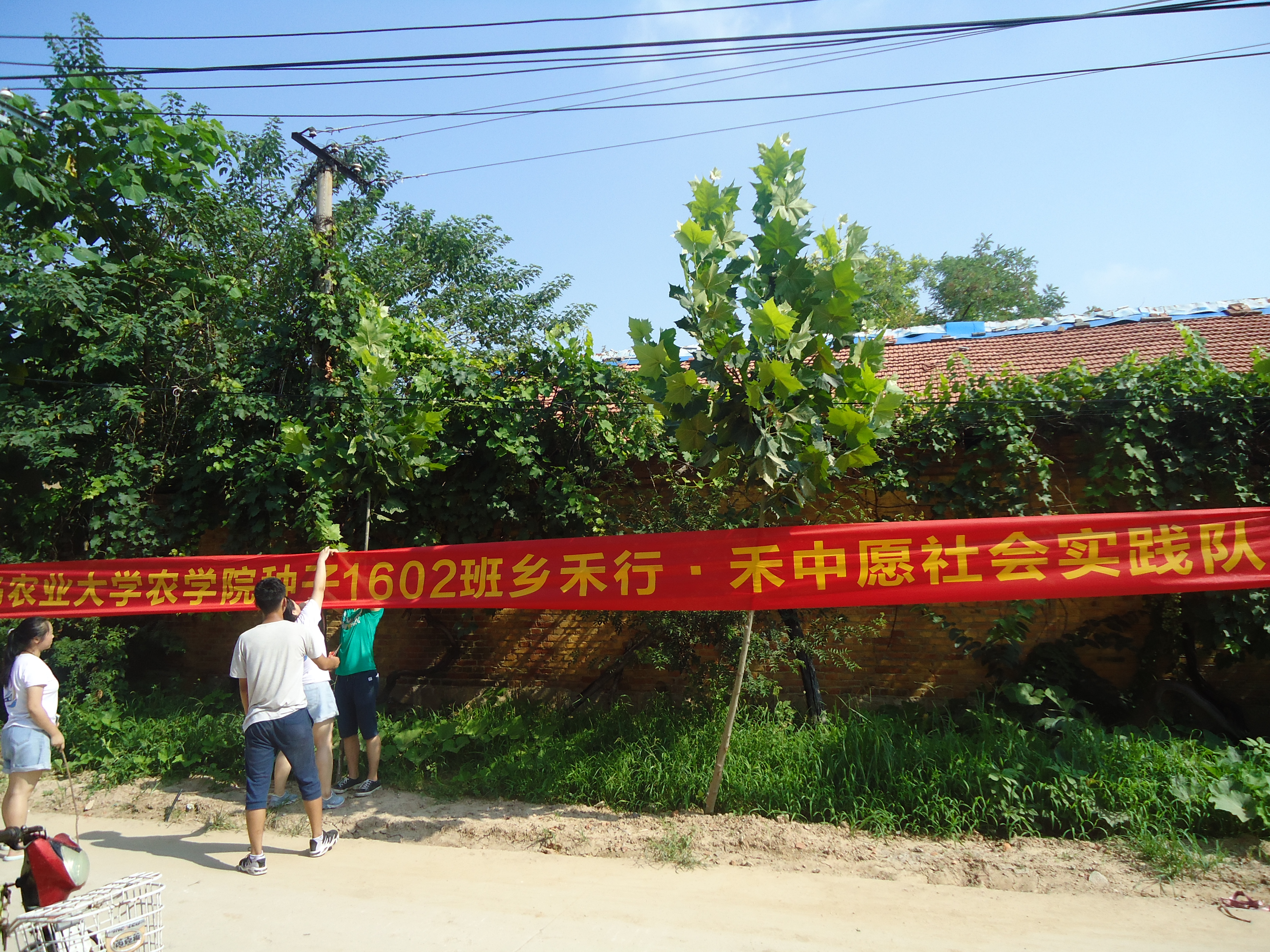 “心中有绿,脚下留青;支教助学,竭心尽力”。队员们到了实践地之后,都开始行动起来:挂横幅,立队旗,扫院子,泼水,抬桌子,与此同时,与当地村民积极交流,做好第一天的宣传准备工作。有幸的是,在队员实践的第一天中,村支书就来到实践地点为同学们提供帮助与支持,队长与村支书进行了长时间的交流,询问了村内的基本问题,同时也向村支书提出了他们的建议与想法,例如召集村内党员开展“两学一做”党员教育活动,为村内贫困家庭募捐等,这着实为队员进行下一步的调研工作奠定了基础。