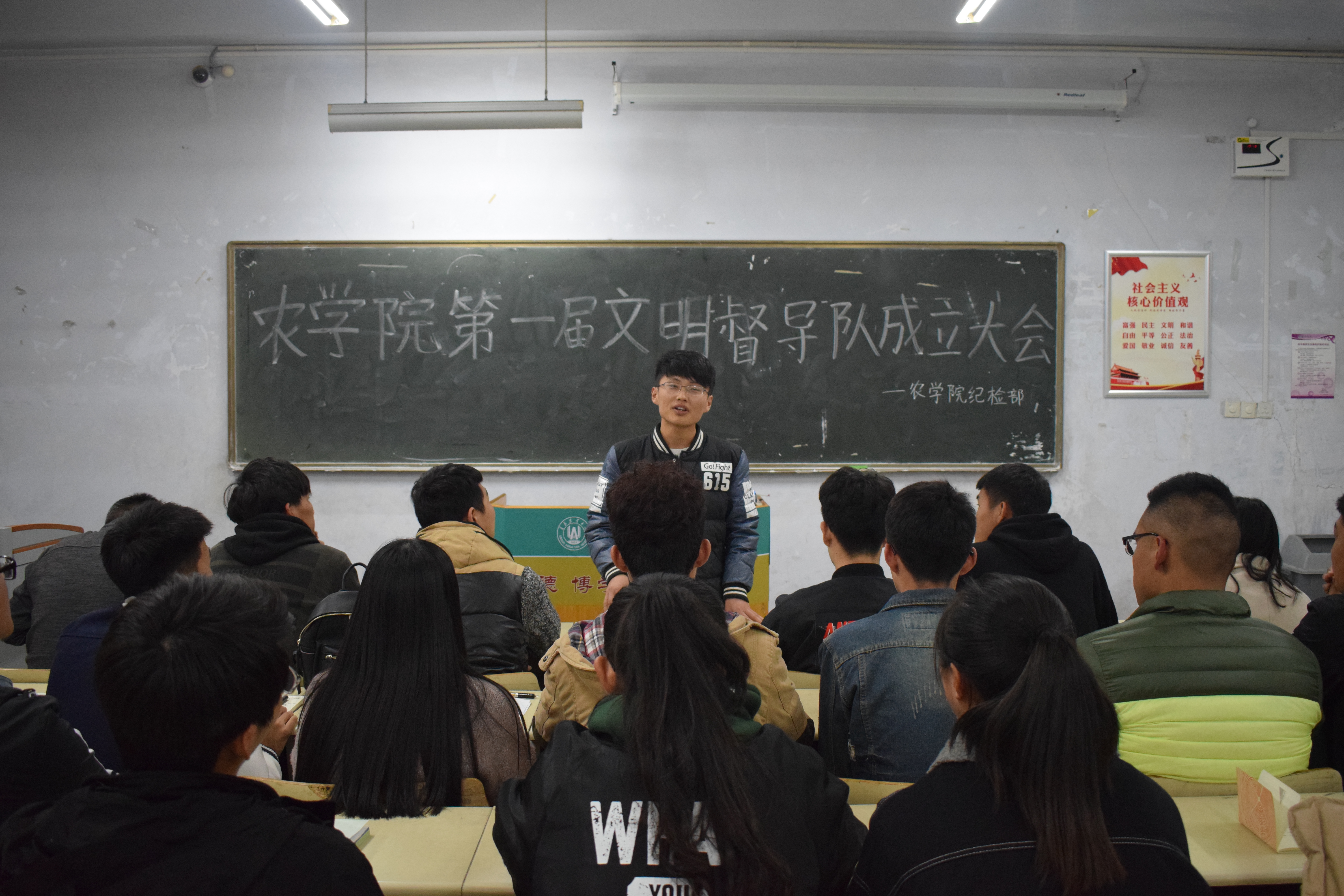会议开始,王太行对文明督导队的成立发表自己的看法。随后,纪检部干事轮流上台发言,分享自己的工作经验。17级的督导队成员们也都一一上台演讲,发表自己对加入、成为文明督导队其中的一员的感想以及各自对未来的打算。最后,王太行对以后文明督导队的工作准则进行强调与改进,对成员们以后的工作态度提出严格要求,对文明督导队的过去与将来分别做出总结与规划,并提出对新成员殷切的期望。