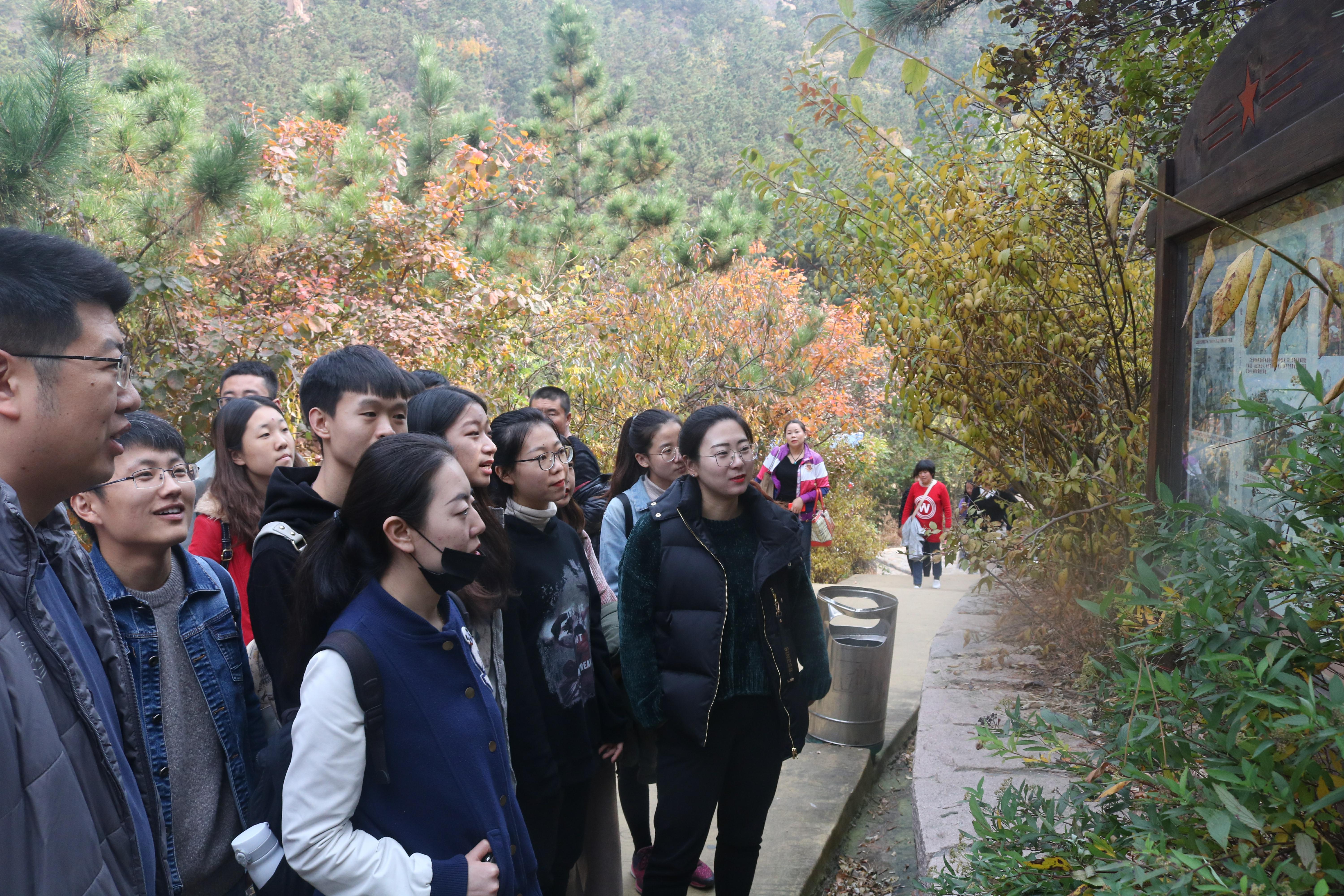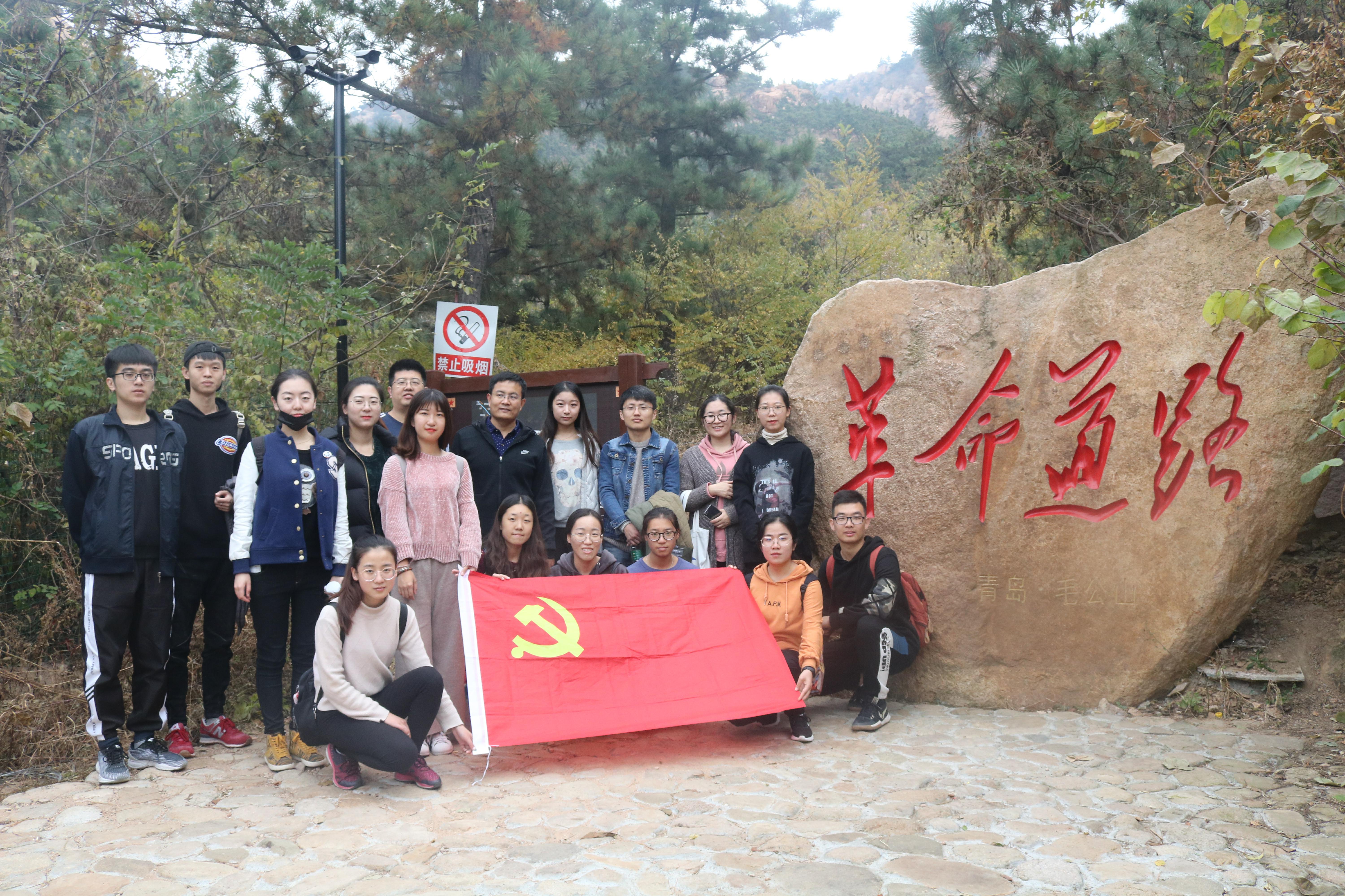 毛公山景区位于青岛市城阳区惜福镇,因一个天然形成的身着中山装的毛泽东站立石像而闻名。登山过程中,姜涛带领员工党员仔细观看山上的文字,从毛泽东少年的凌云壮志、到参加指挥革命的从容不迫,再到新中国成立后旧体制改造的大局意识,同学们的敬畏之心油然而生。大家结合日常所学,认真学习毛泽东同志的生平事迹,重温老一辈革命家走过的革命道路,了解伟人传奇的一生,回顾解放青岛的历史故事。姜涛告诫大家,要谨记和平安定生活的来之不易,深刻感受先辈为革命抛头颅洒热血的崇高品质。最后,一行人在“革命道路”石刻前合影留念。